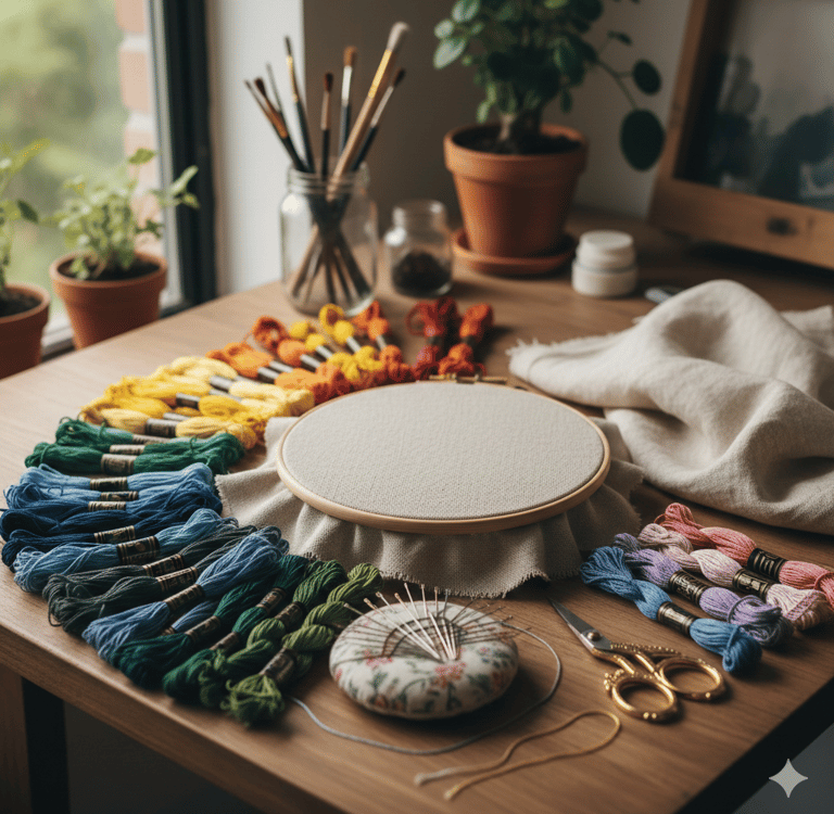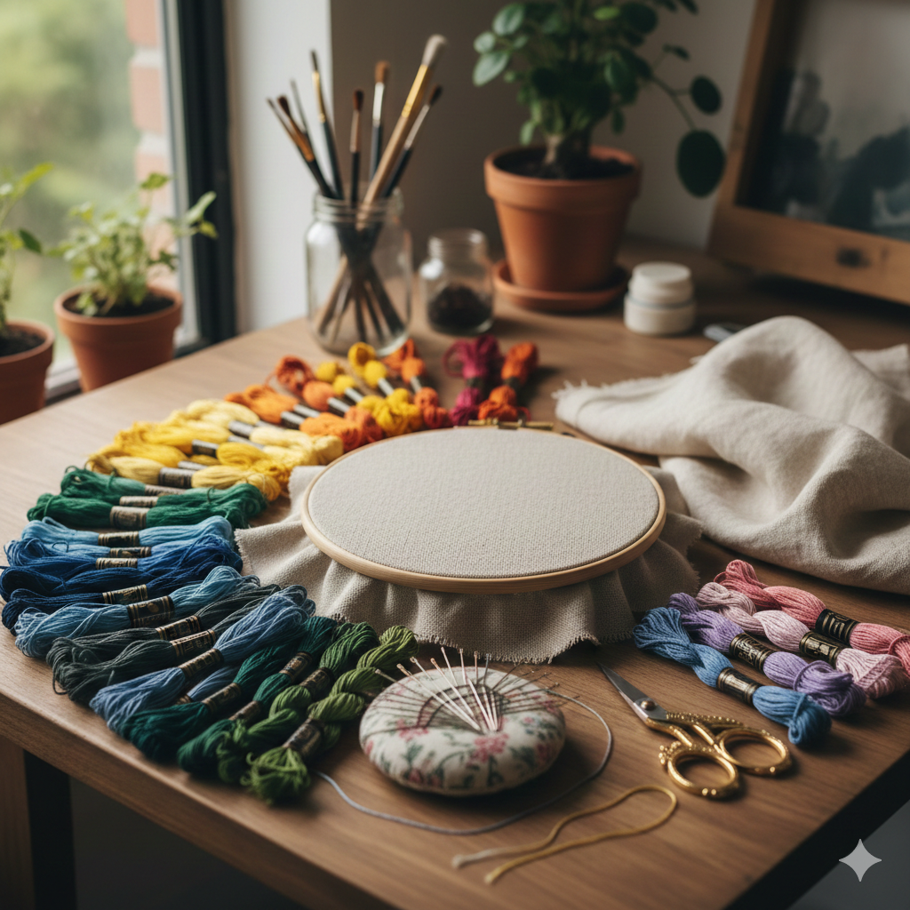 Se você está começando no bordado e ficou perdida em meio a bastidores, linhas, agulhas e tecidos… respira. Todo mundo passa por essa fase. A boa notícia é que você não precisa de um arsenal para criar algo bonito — dá pra começar com o básico e ir evoluindo aos poucos.